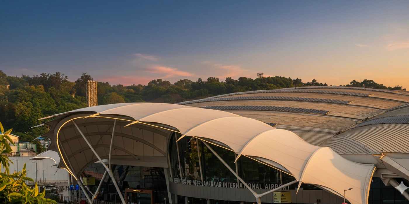 The outdoor shade structure at Pune International Airport employs advanced tensile fabric technology combined with modular steel frameworks to provide expansive, durable, and visually appealing shelter for passengers and airport visitors. These tensile shades are designed to withstand Pune’s climate, offering effective protection against heat, rain, and UV radiation while allowing natural light to permeate, thus maintaining a bright and airy atmosphere under the canopy.
